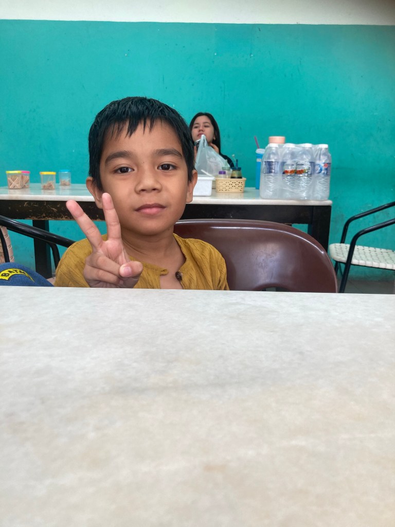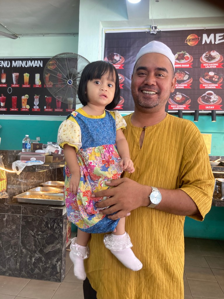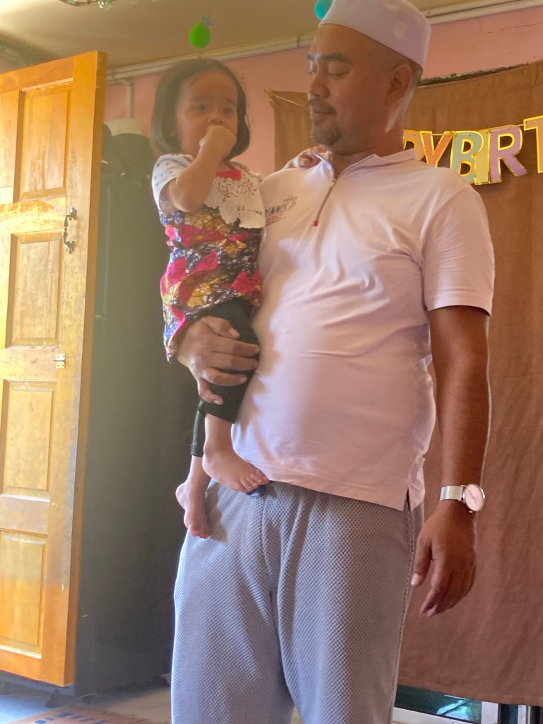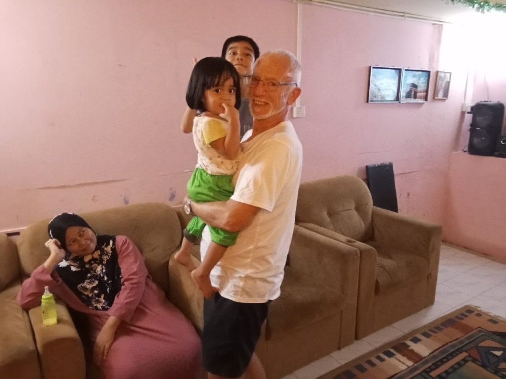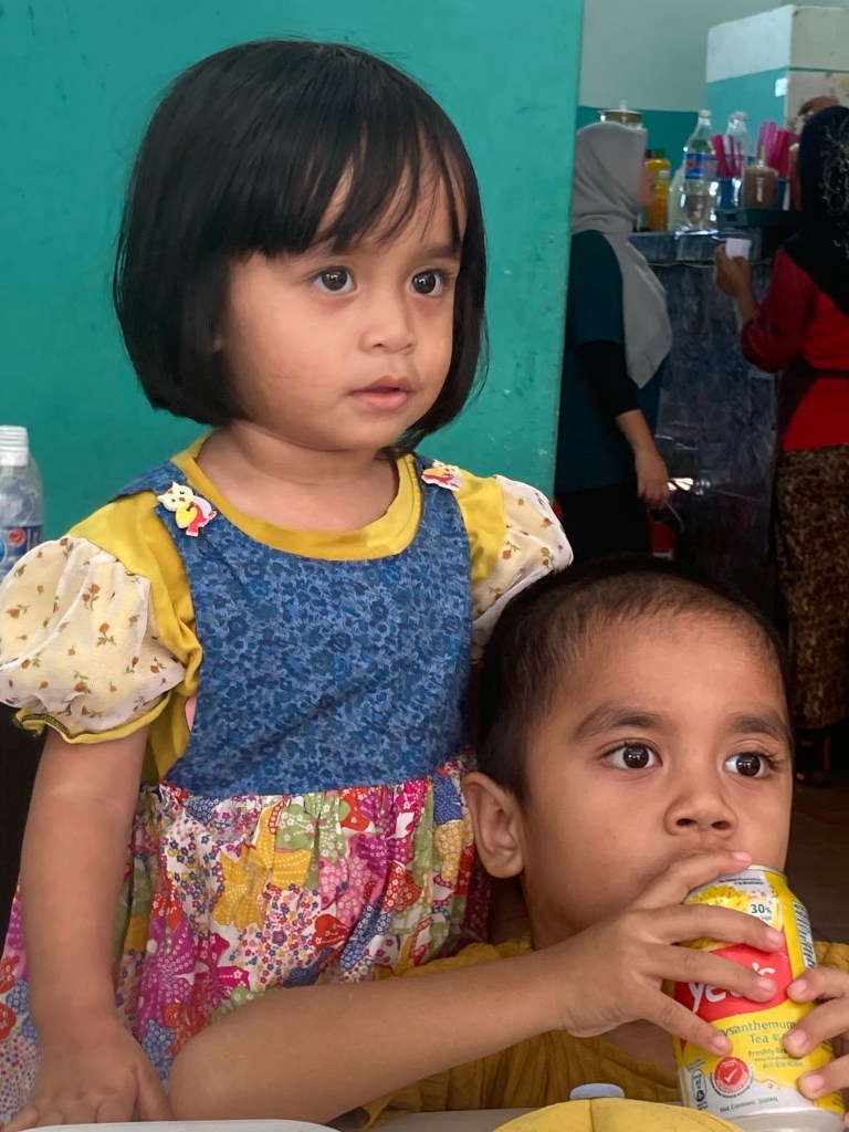 I stayed in a hotel, about 30 minutes from their place in the village, in the nearby town of Kota Belud. So in the evening Andi picked me up, and we negotiated the potholed roads, the wandering groups of cows, the stray dogs and the narrow roads to have dinner together. The food was great, and the kids played nicely together. But still little Nur was terrified.