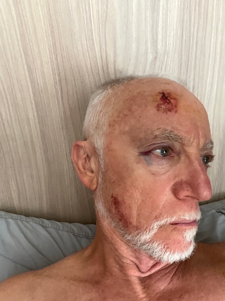 On Wednesday evening I was cruising along the street heading toward the Indian place for dinner, when, in the shadows and encountering a bit of seriously degraded footpath, I tripped and hurtled down the slope and headbutted the wall at the bottom. Shoot…I thought I had had it. Passers-by stopped and helped me up, and a waiter from the restaurant came out with a bottle of dettol and some serviettes…I was a client of the place after all. He dabbed away at the wounds. A very delightful woman, an international student from Djibouti, took charge of getting me to a clinic despite my protestations that it was only a flesh wound. She was super charming, and bundled me into a Grabcar which took me to the clinic.