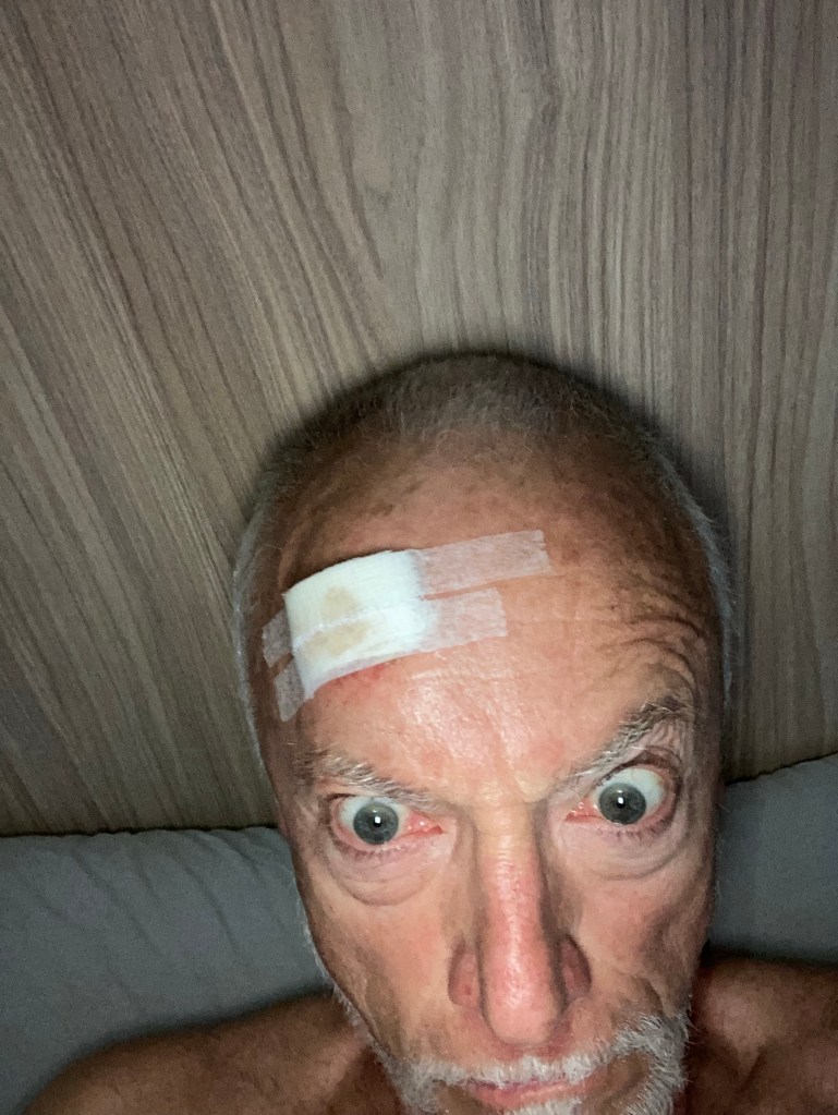 Soon I saw the doctor who washed the blood off, disinfected, and ultimately sewed up the gash in the forehead. He was a chubby guy, and he braced his belly against my shoulder as he sewed away. It was strangely comforting to have a warm mass to lean into in my hour of need. I hadn’t realised that I had blood all down my face, so I must have been a sight when I arrived.