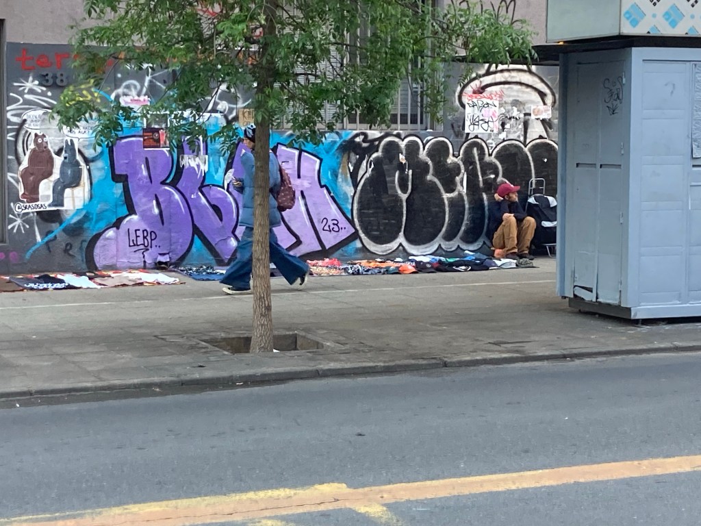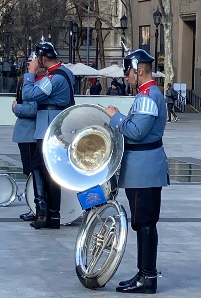 I have spent several days just wandering and looking, and have noted the number of demonstrations and ceremonies at the memorials in in middle of the Avenida Libertador Bernardo O’Higgins. Here’s a lone brass player waiting for the show…