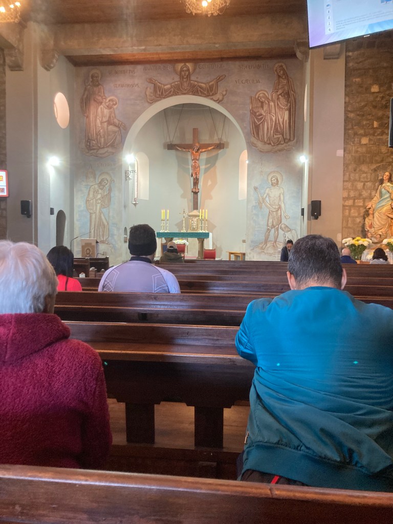 It’s very restful inside, with the remnants of incense to stimulate the nose, piped Gregorian chant to do the same for the ears, and the riot of colour and pious objects doing it for the eyes.