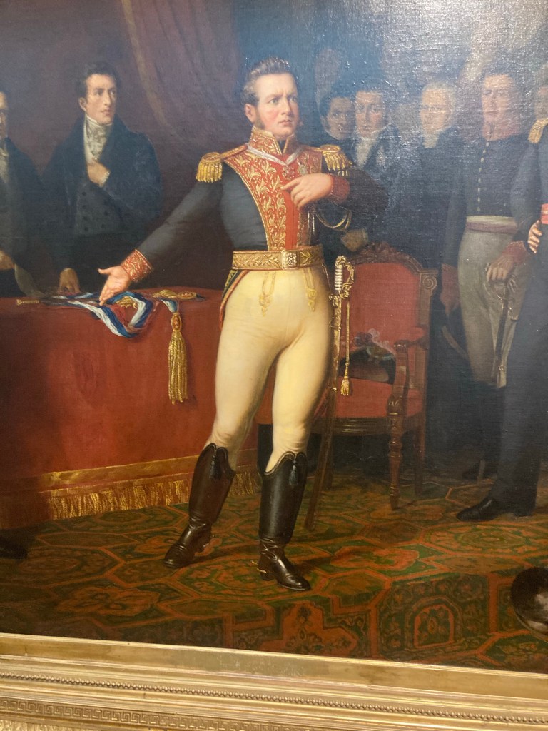 There is another museum on the Plaza de Armas. It’s a social history of the country, with quite a bit about the independence struggles in the early 1800s. And of course there are paintings of Bernardo O’Higgins, hero of the revolution. Here he is after the dust had settled, and as supreme ruler wanted to bring in changes in the structure of society. However conservatives wanted to keep them, so they forced him to abdicate. Here he is doing it…